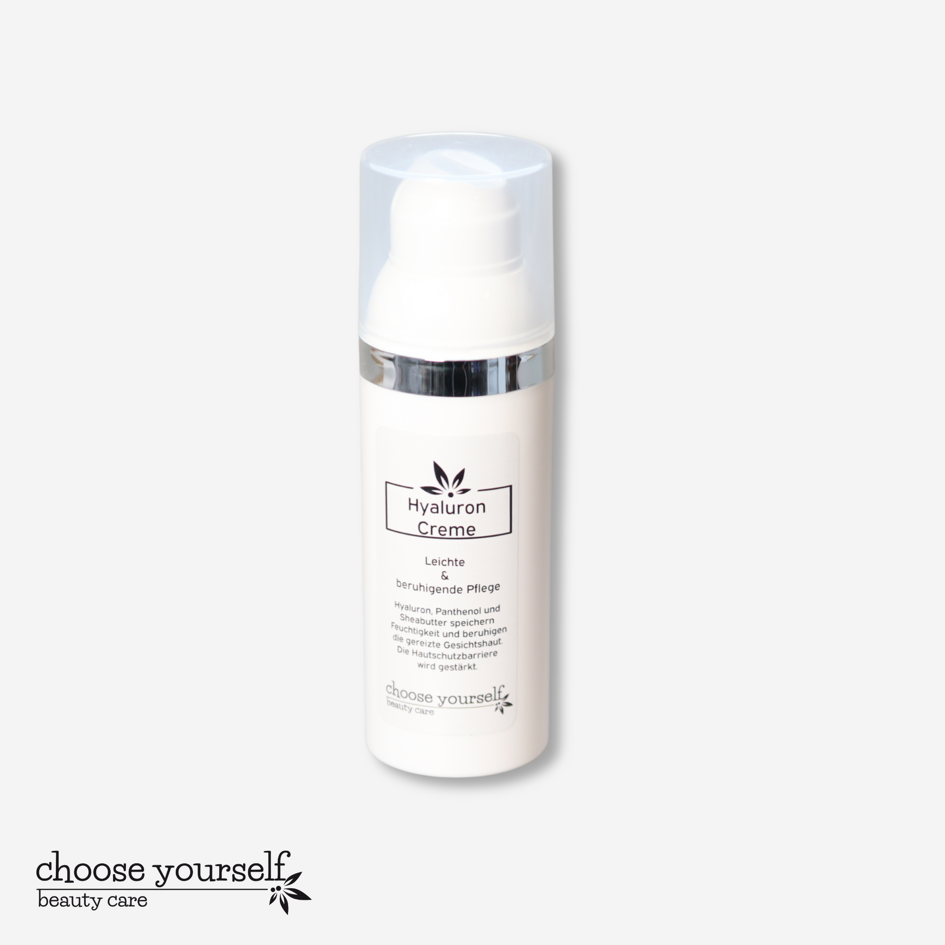 Anti Aging - und Feuchtigkeitspflege. Trockene, feuchtigkeitsarme und gereizte Haut wird mit der Hyaluroncreme bestens versorgt. Sie enthält Hyaluron, Panthenol und Sheabutter und speichert dadurch Feuchtigkeit, strafft die Haut und wirkt beruhigend.
